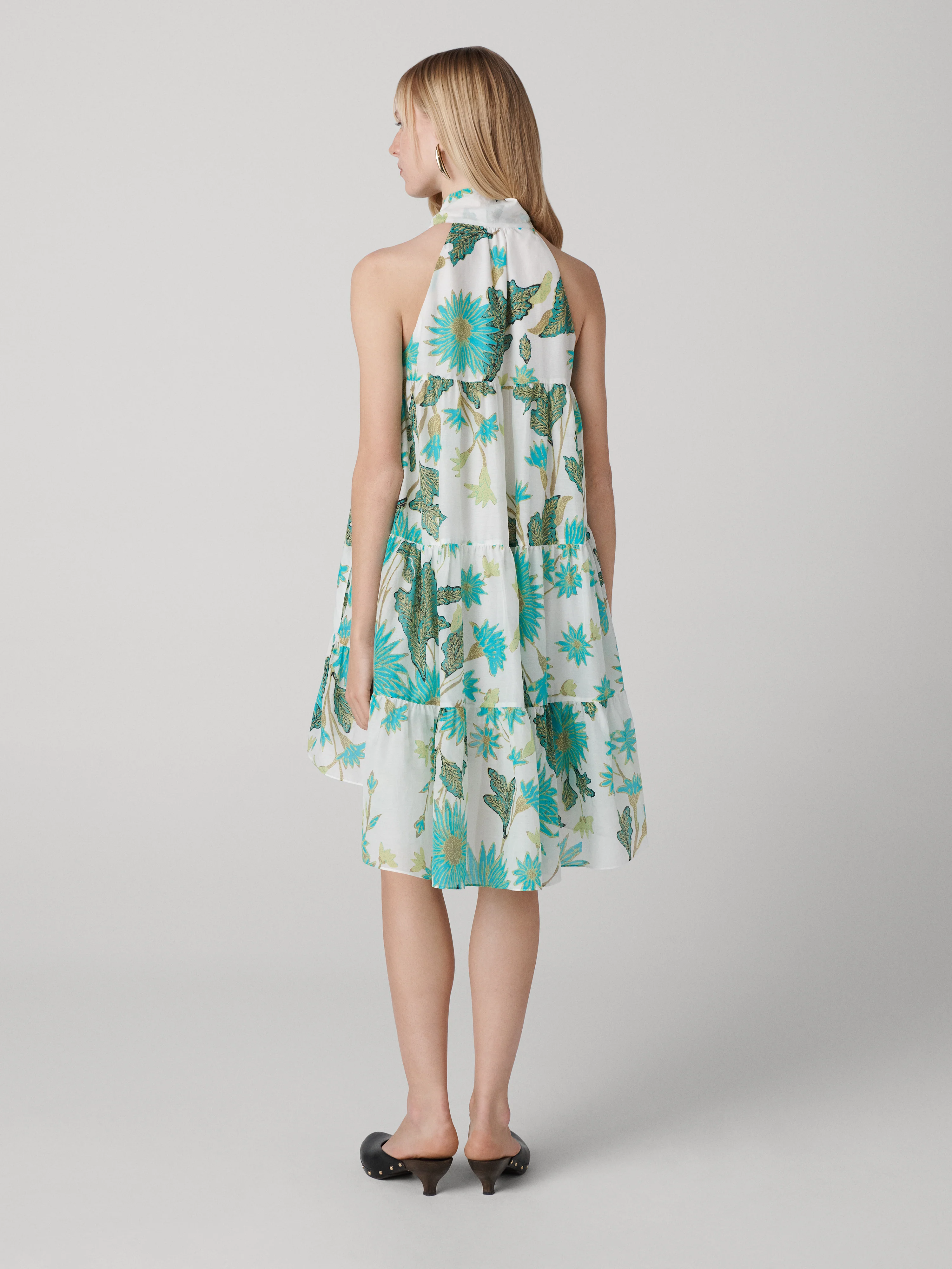 - High neck with bow detail